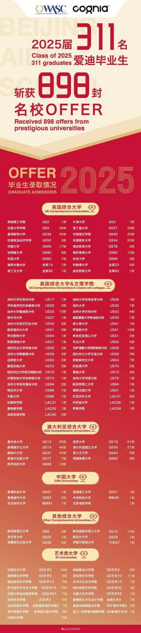 爱迪学校2025届311名毕业生共斩获来自7个国家和地区的898封国际名校录取通知书**,75%进入QS前50大学。并连续6年收获牛剑录取offer。毕业生整体录取率稳定保持25%以上升入世界Top20大学(相当于清北)、75%以上世界Top50(相当于清北复交浙)、100%升入世界Top100大学,艺术方向也实现连续7年50%进入世界Top3顶尖艺术院校的升学率。